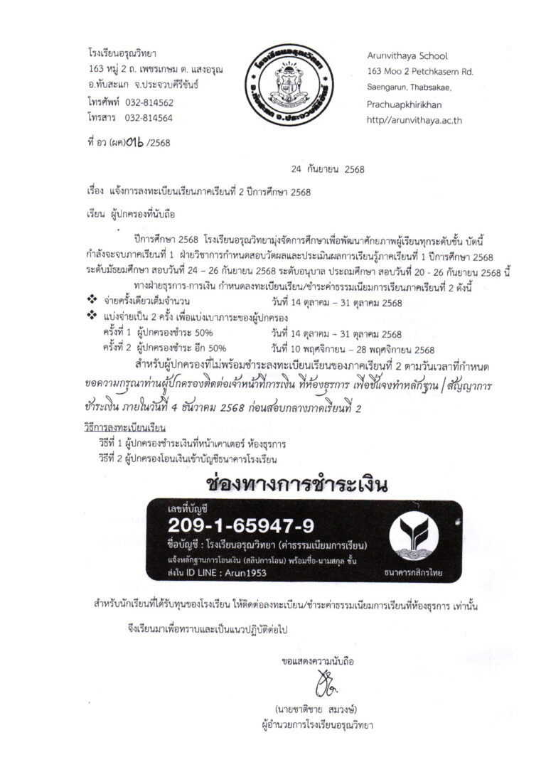 แจ้งการลงทะเบียนเรียนภาคเรียนที่ 2 ปีการศึกษา 2568