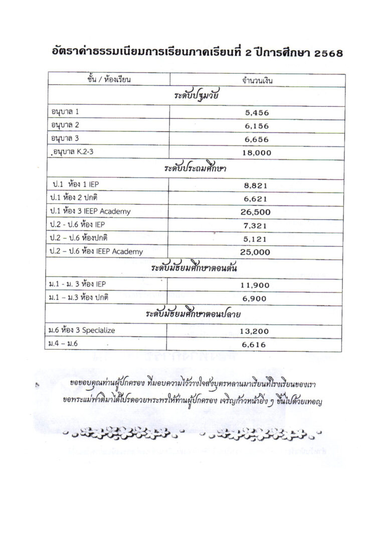 อัตราค่าธรรมเนียมการเรียนภาคเรียนที่ 2 ปีการศึกษา 2568